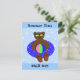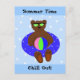 A cool teddybear in a blue floating tube with a bright coloured beach ball and sporty sunglasses on. Says Chill Out!