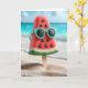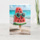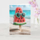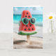 A watermelon popsicle wearing sunglasses stands in the beach sand.