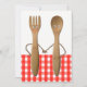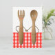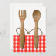 Bridal shower invites featuring funny spoon and fork bride and groom couple cartoon for BBQ, kitchen bridal shower or picnic wedding event.