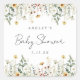 This design features a watercolor border of wildflowers in shades of gold, red, blue, and green. Perfect for spring and summer baby showers.