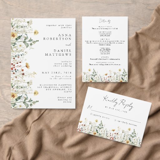 This design features a watercolor border of wildflowers in shades of gold, red, blue, and green. Perfect for spring and summer weddings.