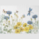 Vintage wildflower illustrations on a pale floral background. Flowers include chicory, lavender, chamomile, Queen Anne's Lace, buttercup, meadow grass, and cornflower in a mix of yellows, whites, and blues. Butterflies, a dragonfly and a honeybee are busy pollinating the meadow. Could be used as a giftwrap for a gardener or for a decoupage or furniture transfer project.