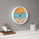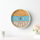 This pretty wall clock is inspired by the beach and relaxing summer days. The all-white typography says, "Summertime and the Livin' is Breezy." The background is colour-blocked with the top a sunny orange, the middle a wavy blue to look like water and the bottom a sandy beige. The design has cute flourishes and white markings along the edge to tell the time.