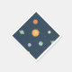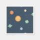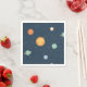 Space themed party supplies with doodles of the sun and planets over a dark blue backdrop decorated with little stars. Keep a look out for planet Earth that has clouds as eye brows. Colourful and cheerful pattern.