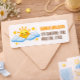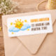 A cheerful watercolor sky illustration featuring a cute smiling sun rising above fluffy blue clouds and tiny golden stars. The warm yellow and soft blue palette creates a bright, playful atmosphere inspired by modern sunshine-themed baby celebrations in the U.S. The friendly illustration style paired with clean typography adds a charming and memorable touch to party stationery and envelope details.