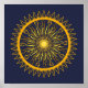 Beautiful circular sun mandala design in orange, gold, yellow on dark blue background.