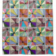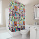This shower curtain has an abstract design that is made of nine squares with a circle and “rays” coming out of the circle in many different colours.