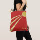 Elegant tote bag with sun rays on red background. Three rays emerging from the sun are three aspects of life: body, mind and spirit. The sunny text can be personalized.