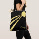 Elegant tote bag with sun rays on black background. Three rays emerging from the sun are three aspects of life: body, mind and spirit. The sunny text can be personalized.