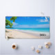 Desk mat with a lovely photograph. A white sandy beach with azure blue water. Relaxing image with a sunny sky and gentle foamy surf with some cute tropical leaves framing the image.