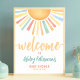 Welcome guests to your baby shower with this bright and cheerful sun-themed welcome sign! A large sun with vibrant rays in shades of yellow, orange, teal, blue, and red beams from the top, surrounded by a few soft light blue clouds for a sweet and playful touch. Just below, the word "Welcome" is displayed in a fun mix of bold script and modern fonts, setting a warm and joyful tone.