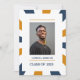 This graduation card announcement features a sunburst background in navy, orange and white colours with a room for a vertical photo framed by a white frame.Personalize the card adding your photo, name and year.