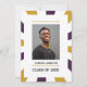 This graduation card announcement features a sunburst background in purple grape, orange and white colours with a room for a vertical photo framed by a white frame.Personalize the card adding your photo, name and year.