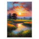 Witness the sun's fiery farewell from a tranquil swampy meadow, where vibrant grasses paint the land in hues unseen. Trees stand sentinel on the horizon, adorned in the warm embrace of twilight. In this digital artwork, classic oil-painting style captures the symphony of colours as day bids adieu, leaving behind a tapestry of nature's brilliance.