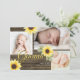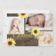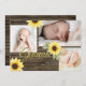 Yellow Sunflowers and rustic barn wood three photo baby birth announcement for new baby or edit text as preferred for any occasion.