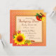 Elegant harvest invitation with sunflowers, wheat, acorns, leaves, mushrooms, berries, and a bird. Set in a white polkadot on orange background.