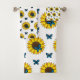 A drawing of a cartoon sunflower and a blue butterfly. This yellow floral design is a gift idea for summer lovers, flower and nature lovers, and autumn lovers.