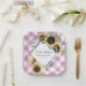 Rustic personalized paper wedding plates for your couples shower, bridal shower, wedding shower or I Do BBQ feature a country design boarder with a watercolor sunflowers and greenery with a pink gingham chequered pattern. Personalize with your names and date. To see more designs like this visit www.zazzle.com/vginvites