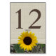 Yellow Sunflower and burlap with nature's own camouflage of tree bark and leaves, printed design table number card to compliment our woodland sunflower invitation set, can be personalized and ordered individually. All parts of this card are printed. There are no burlap or flower attached.