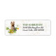 Le côté gauche de ces étiquettes d'adresse de retour présente une aquarelle d'un adorable chien australien Terrier parmi des tournesols épars et des feuilles d'eucalyptus. Des confettis d'or subtil ajoutent de l'intérêt à l'arrière - plan. Votre texte personnalisé est en vert et gris foncé à droite.