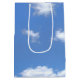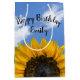 Bright yellow sunflower peeking over edge on summer blue sky and cloud background.