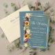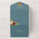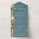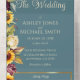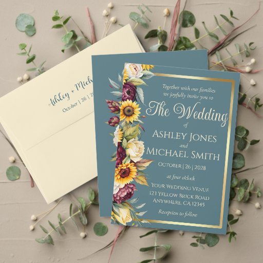 This elegant all-in-one wedding invitation design features a stunning watercolor design of sunflowers, roses, and peonies lining one side. The vibrant florals are complemented by a sophisticated gold frame that borders the reply card, adding a touch of luxury. This beautiful blend of colours and elegance makes it the perfect choice for a fall wedding, capturing the essence of the season with grace and charm.