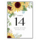 Ces panneaux modernes de numéro de table de tournesol disposent de luxueux bouquets de fleurs de tournesol avec fleurs sauvages et verdure. Personnalisé avec vos noms et date mariage. L'image est la même avant et arrière. Idéal pour la campagne ou les mariage de automne, les mariages rustiques et tous ceux qui aiment les tournesols ! Invitations assorties, et accessoires disponibles. Design©Rosalind Moore, Cherry Lane Designs.