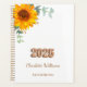 A stylish white background decorated with a rustic watercolored sunflower and eucalyptus greenery. Personalize and add a name and title. The name is written with a large modern hand lettered style script. Year 2025 is written with a balloon style font. Perfect for school, work or organizing your personal/family life.