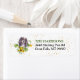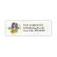 The left side of these return address labels feature a watercolor image of an adorable tri colour Cavalier King Charles Spaniel dog among scattered sunflowers and eucalyptus leaves. Your custom text is in green and dark grey at the right. A smattering of subtle gold confetti adds a bit more interest to the background.