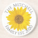 A close-up photo of a bright yellow sunflower with custom family name and year of establishment.