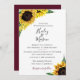 Painted sunflowers and leaves, wedding invitation. Customize font style, colour and size. Invitation backing colour shown in Bordeaux can be edited to match your wedding colours.