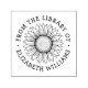 From the library of or this book belongs to rubber stamp with a drawing of a beautiful sunflower at the center and your custom text and name in a whimsical serif font.