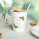 Design features sunflowers and botanical leaves over a printed gold coloured geometric frame.