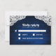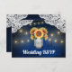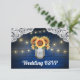 Sunflower Mason Jar Blue Wood Wedding RSVP Cards - feature a royal navy or blue barn background trimmed with lace and decorated with warm coloured string twinkle lights. The design also features a bouquet of sunflowers inside a mason jar that you can customize the initials to those of your choice. The back also features the same country rustic background to match the front.
