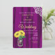 Stylish, country rustic invitations in a purple wood grain effect with a pretty mason jar vase full of yellow sun flowers and a pretty white lace pattern on the edges. Ideal barn weddings and Thanksgiving fall time weddings.
