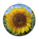 Close up of a sunflower taken against a backdrop of a field of sunflowers