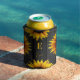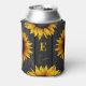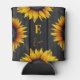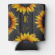 Elegant stylish bright yellow sunflowers bouquet can cooler with a signature script calligraphy name and monogram initial over a dark brown barn wood rustic modern background. ++++++++ Could be a nice keepsake gift for a bridal shower, birthday, Sweet 16, bachelorette party, wedding team bride, bridesmaids, or maid of honour.