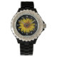 This stylish rhinestone-encrusted designer watch has a black background with a large yellow Sunflower head and large white numerals for easy reading.