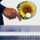 Close up of a sunflower taken against a backdrop of a field of sunflowers