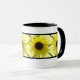 A cheerful mug with sunflowers heads on a black and yellow crisscross background. The ringer mug is accented in black, but can be "Customized" to another colour.