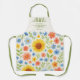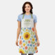 An ivory coloured background decorated with a pattern of yellow sunflowers, coral and blue flowers. Personalize and add a name and text. Kitchen utensils are framing the name.
