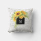 A cheerful modern design featuring a small black dots pattern over a white background with a floral monogram frame edged in colourful yellow watercolor sunflowers. Edit the sample monogram with your initial for a custom pillow that is uniquely yours.