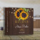 Editable text recipes binder featuring rustic strings of twinkle lights and big sunflowers on dark brown barn wood background. Insert your text in the spots! This recipe book can be a beautiful gift for your own kitchen or a keepsake personalized gift for someone special, anniversary, birthday, Christmas, bridal shower or wedding gift.