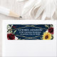 Design features a printed dark navy blue wood grain background with a geometric gold colored frame that's decorated with burgundy red roses, blush floral elements, sunflowers, greenery and eucalyptus.