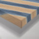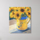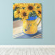 Oil painting of Sunflowers in a yellow and blue pitcher on a blue stripped linen table runner.