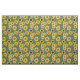 Sunflowers fabric with repeating pattern. Yellow flowers are interspersed with little dots of color, over a dark gray-green background color.