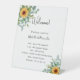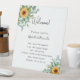 A modern, elegant, wedding program, timeline. A chic white background. Decorated with sunflowers, green watercolored eucalyptus greenery. Personalize and add your names and wedding details. Black coloured letters. If you have more text it's possible to reduce the line space.