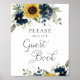 Sunflowers Floral Navy Blue Greenery Wedding Guest Book Sign. Floral Rustic Wedding Signage.