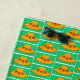 Graphic drawing, of bright-yellow hat with Sunflower blossoms, on brim, with orange trim-displayed against, a lime-green, background.