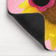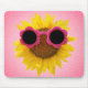 Yellow sunflower wearing pink sunglasses on white polka dot and pink background.
